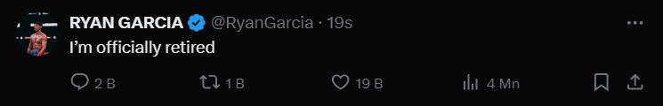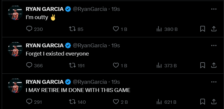 Ryan Garcia, Çarşamba günü bir dizi tweet atarak emekliliğini açıkladı. Annesinin kanser olduğunu ve boşanma aşamasında olduğunu, bunlara ek olarak Devin galibiyetinin elinden alınmaya çalışıldığını söylediği bir tweet zinciri yaptı.